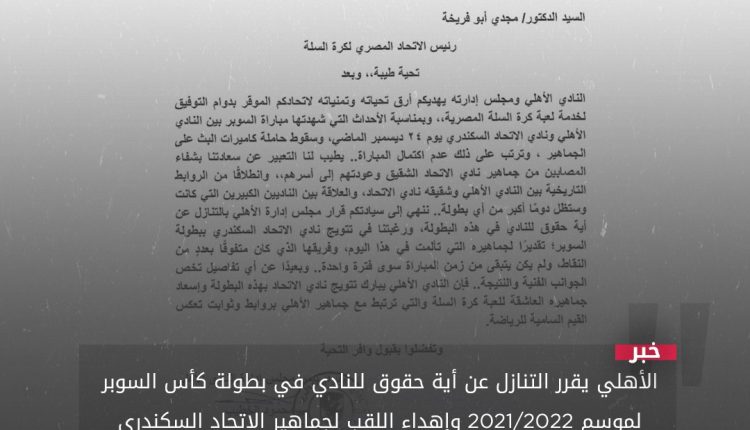 ننهي إلى سيادتكم قرار مجلس إدارة الأهلي بالتنازل عن أية حقوق للنادي في هذه البطولة، ورغبتنا في تتويج نادي الاتحاد السكندري ببطولة السوبر، تقديرًا لجماهيره التي تألمت في هذا اليوم، وفريقها الذي كان متفوقًا بعددٍ من النقاط،