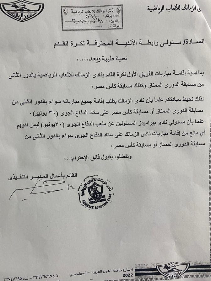 وكذلك ببطولة كأس مصر من استاد القاهرة إلى ملعب الدفاع الجوي. وردا على هذه الادعاءات الكاذبة ننشر الخطاب المرسل من نادي الزمالك الي لجنة الأندية لنقل مباريات نادي الزمالك من استاد القاهرة الي ملعب الدفاع الجوي “30 يونيو ” والذي تم إرساله منذ أربعة عشر يوما بتاريخ 11 مايو 2022.