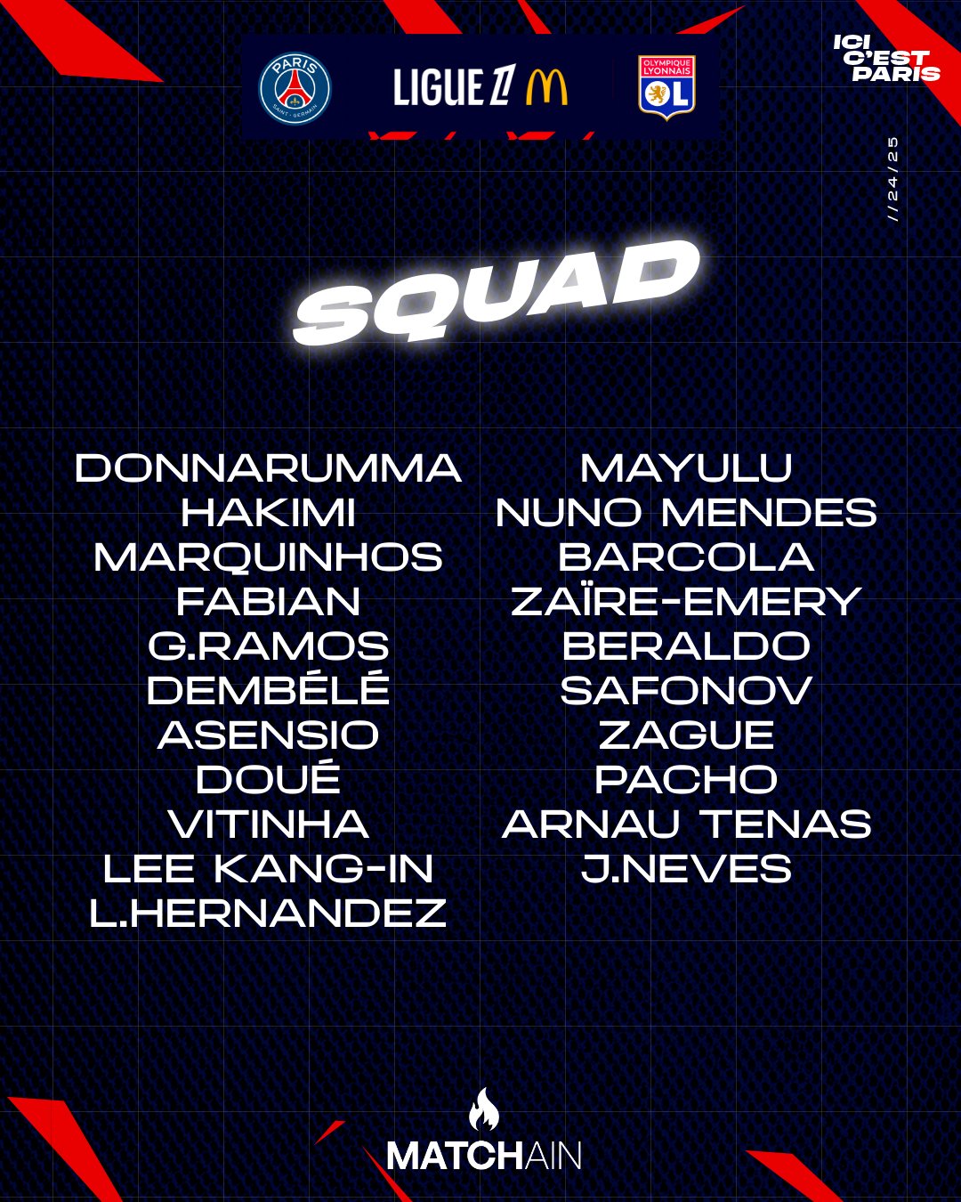 وتضمنت القائمة 21 لاعبًا هم: جيانلويجي دوناروما، أشرف حكيمي، ماركينيوس، فابيان رويز، جونسالو راموس، عثمان ديمبيلي، ماركو أسينسيو، ديزيريه دوي، فيتينا، لي كانج إن، لوكاس هيرنانديز، سيني مايولو، نونو مينديز، برادلي باركولا، وارن زائير إيمري، لوكاس بيرالدو، ماتفي سافونوف، يورام زاج، ويليان باتشو، أرناو تيناس، وجواو نيفيز.