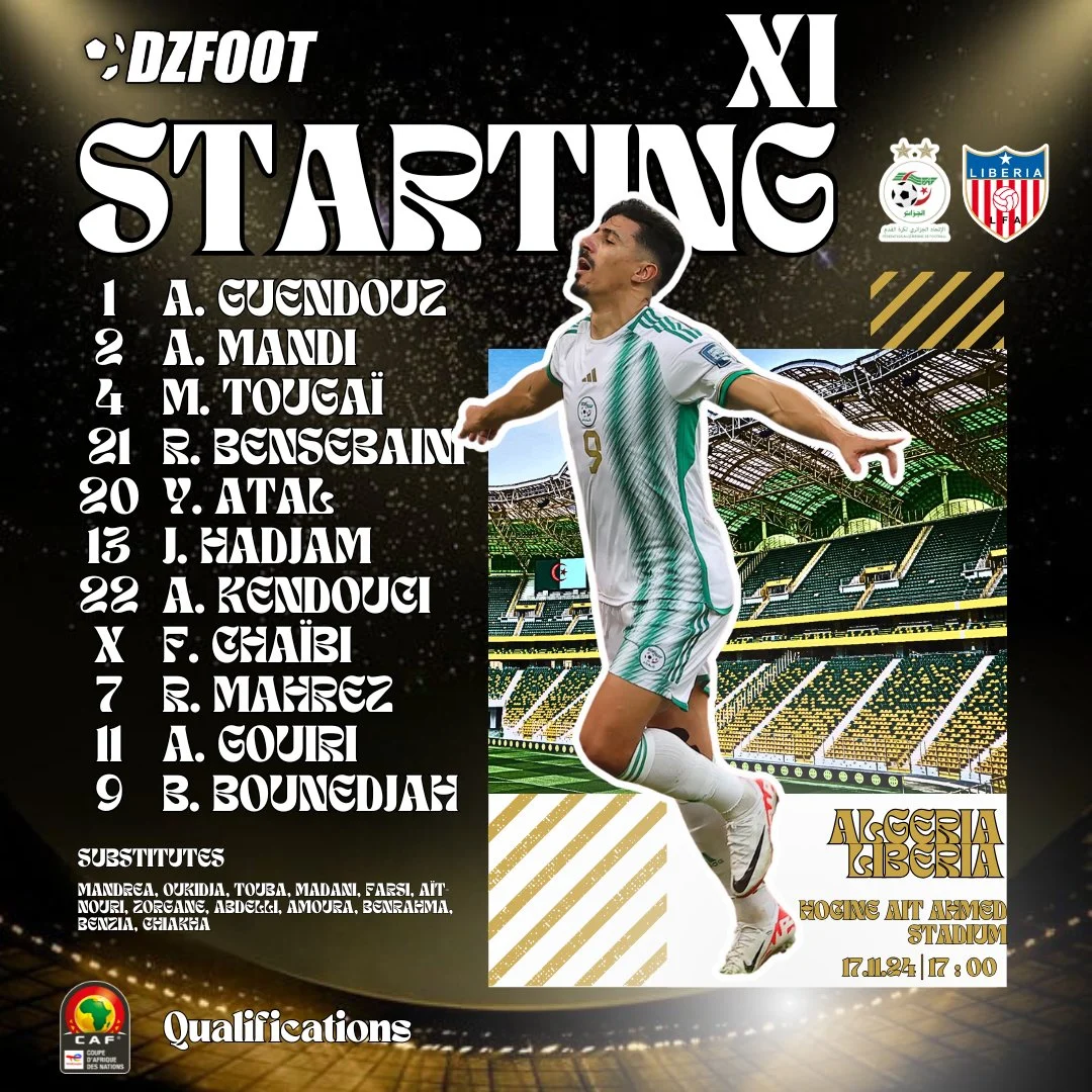 أعلن فلاديمير بيتكوفيتش، المدير الفني لمنتخب الجزائر، التشكيلة الأساسية التي ستخوض مباراة اليوم الأحد ضد منتخب ليبيريا، في الساعة السادسة مساءً، ضمن منافسات الجولة السادسة والأخيرة من تصفيات كأس أمم إفريقيا 2025، المقررة في المغرب، والمقامة على ملعب حسين آيت أحمد.