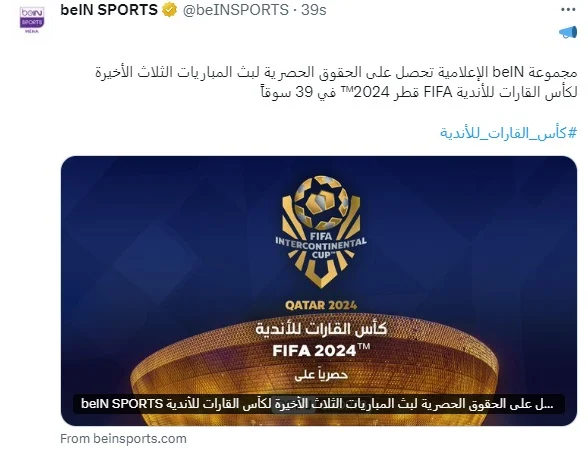 أعلنت مجموعة بي إن سبورت الإعلامية عن حصولها على حقوق بث بطولة كأس إنتركونتيننتال 2024 بشكل حصري في مناطق متعددة من الشرق الأوسط وشمال إفريقيا، وكذلك بعض المناطق الأخرى مثل فرنسا وآسيا والمحيط الهادئ وأمريكا الشمالية، وذلك بمشاركة النادي الأهلي المصري.