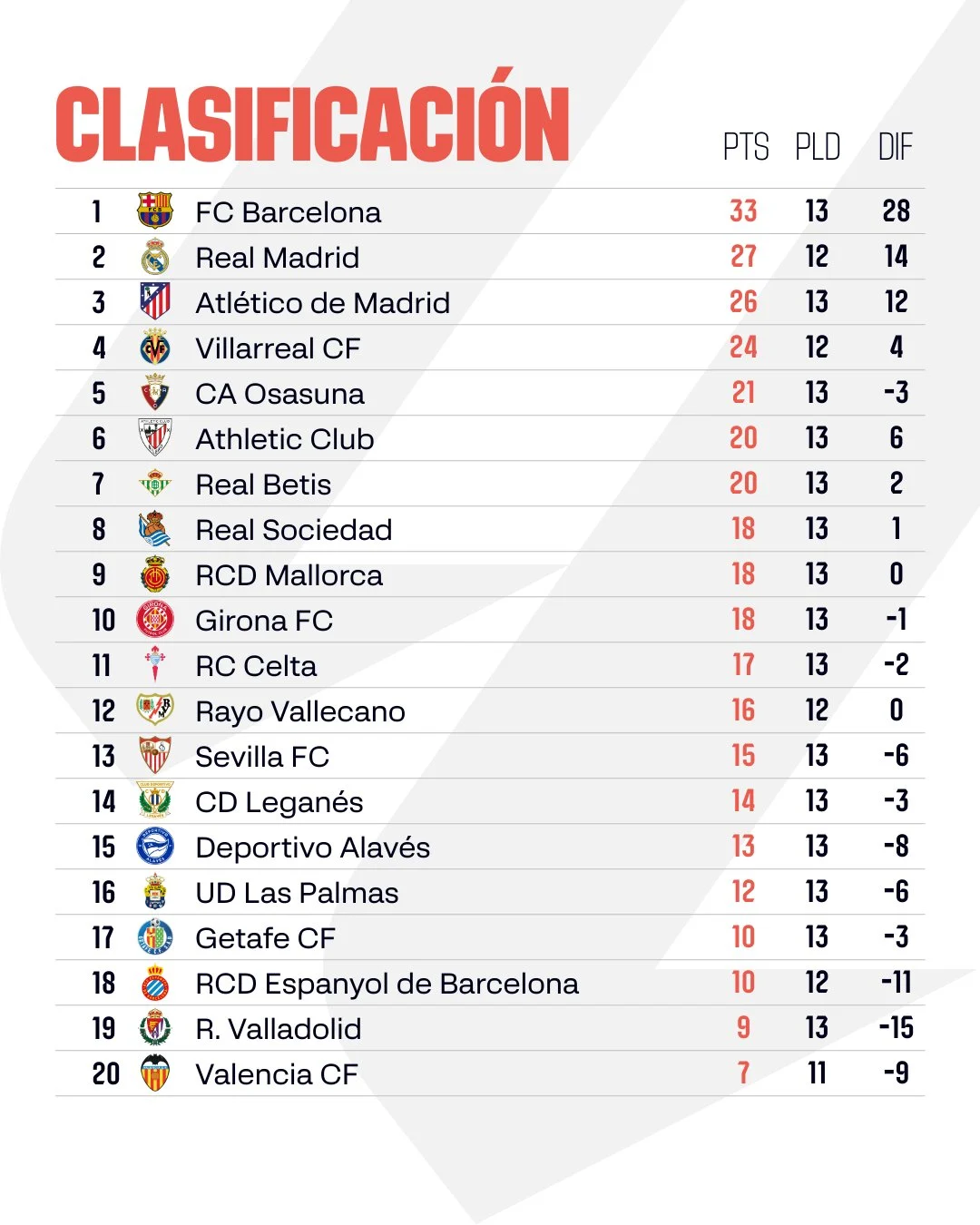 أما في بقية المباريات، فقد حقق أتلتيكو مدريد فوزًا صعبًا على مايوركا بهدف نظيف (0-1)، ليصل إلى 26 نقطة في المركز الثالث. من جانب آخر، واصل فياريال عروضه القوية بفوزه على ألافيس بثلاثية نظيفة (3-0).