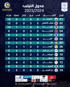وجاء ترتيب الدوري الإماراتي عقب الجولة الخامسة كالتالي