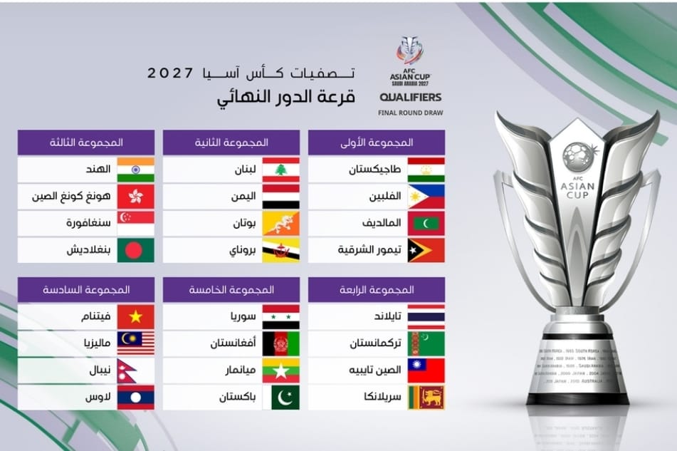 أسفرت قرعة التصفيات النهائية لبطولة كأس آسيا 2027، التي من المقرر لها ان تقام في المملكة العربية السعودية، عن تواجد منتخبي لبنان واليمن في المجموعة الثانية إلى جانب منتخبي بوتان وبروناي.