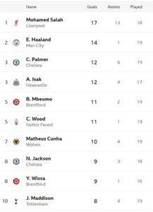 ويحتل صلاح المركز الأول في ترتيب الهدافين برصيد 17 هدفًا، يليه هالاند في المركز الثاني برصيد 14 هدفًا. ويأتي أليكسندر إيزاك وكول بالمير في المركزين الثالث والرابع برصيد 12 هدفًا لكل منهما، ثم بريان مبيومو وكريس وود في المركزين الخامس والسادس برصيد 11 هدفًا.
