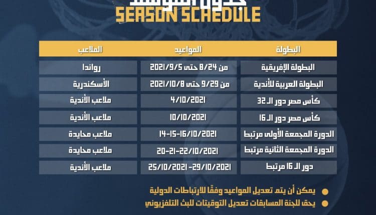 ووفقًا للجدول، فمن المقرر أن تنتهي بطولة كأس مصر بإقامة مباراة النهائي يوم 31 مارس من عام 2022، فيما سيكون نهائي دوري السوبر في شهر مايو من العام القادم.