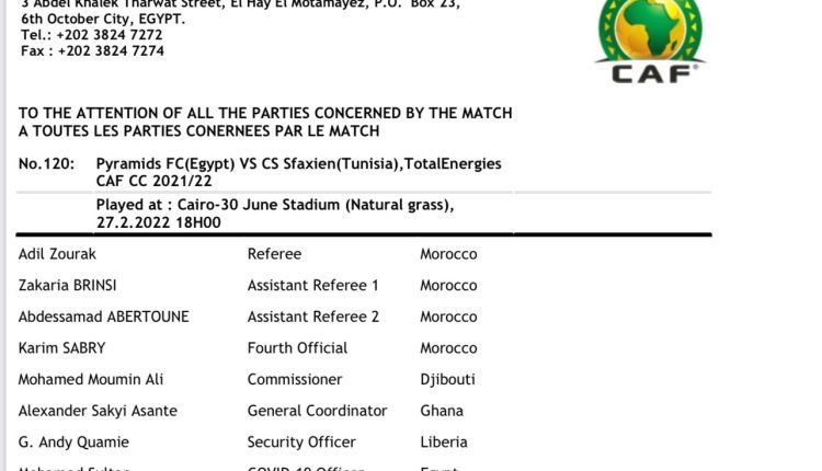 أعلن الاتحاد الأفريقي لكرة القدم، كاف، موعد وحكام مباراة بيراميدز والصفاقسي التونسي في الجولة الثالثة من دور المجموعات لبطولة كأس الكونفدرالية الأفريقية.