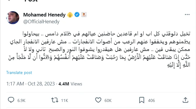 كنب الفنان محمد هنيدي، عبر موقع التدوينات القصيرة تويتر سابقا”X” اكس على حسابه الرسمي يدع الشعب الفسطيني، في محنته والتى يتعرض فيها للقصف من قبل قوات الاحــــــــــــ* تلال الصــــــــ*هيوني في الأونة الأخيرة .